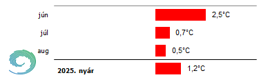 Az idei nyár országos átlagban 1,2 °C-kal volt melegebb a sokéves átlagnál (3. ábra). Az átlagosnál hűvösebb májust követően mindegyik hónapban pozitív anomália volt jellemző. A legnagyobb mértékben a június tért el az 1991-2020-as értéktől (+2,5 °C); ezt követi a július (+0,7 °C), majd az augusztus (+0,5 °C).