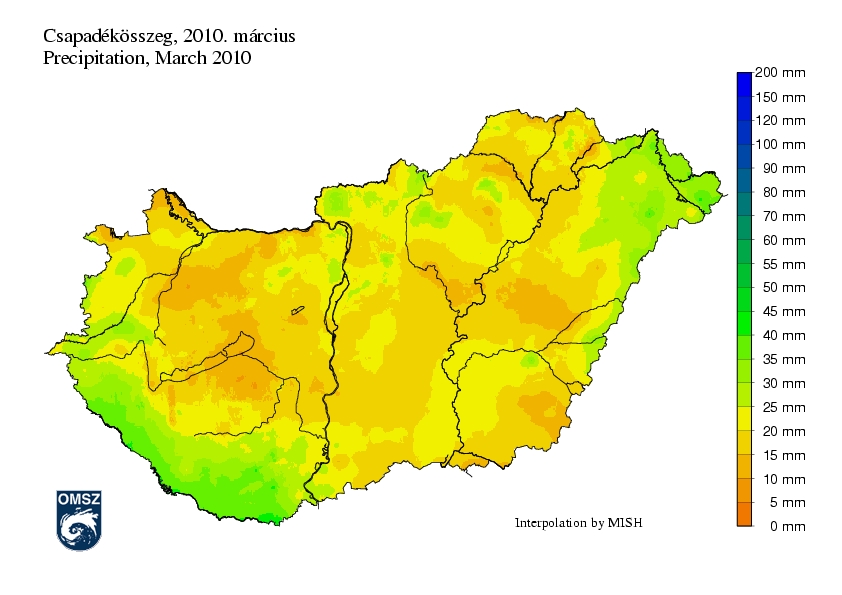 A csapadék havi összege márciusban általában 10 és 35 mm között volt. A Dunántúl déli, délnyugati részén, és a Mecsekben, az Északi-középhegység magasabb régióiban, illetve az északkeleti országrészben 30 mm feletti csapadékösszegeket mértek. Ezzel szemben a Dunántúl középső részén, a Jászság, a Nagykunság és a Hortobágy térségében nem érte el a 15 mm-t a havi csapadékösszeg.