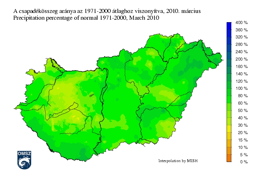 Az elmúlt hónapban hullott csapadékok összege az ország túlnyomó részén elmaradt az ilyenkor szokásos értéktől, helyenként a sokévi átlag 30-40%-át sem érte el. A legkisebb eltérés a délnyugati határ mentén, valamint a Nyírségben és a Szatmári-síkságon látható.