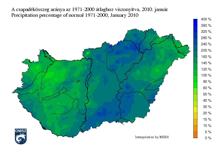 A 2010. januári csapadékösszeg eltérése a sokéves átlagtól széles határok között mozgott. Az ország nagy része csapadékosabb volt a vártnál, általában a szokásos mennyiség 120-240%-a hullott országszerte. Kis terület volt csak az átlagosnál szárazabb. Az Észak-Dunántúlon, különösen a Marcal mentén jelentek meg alacsonyabb értékek, melyek helyenként az átlagos havi összeg 90%-át sem érték el. A legnagyobb pozitív eltérés Borsod-Abaúj-Zemplén megyében rajzolódott ki, itt a szokásos havi csapadékhozam közel háromszorosa is előfordult.