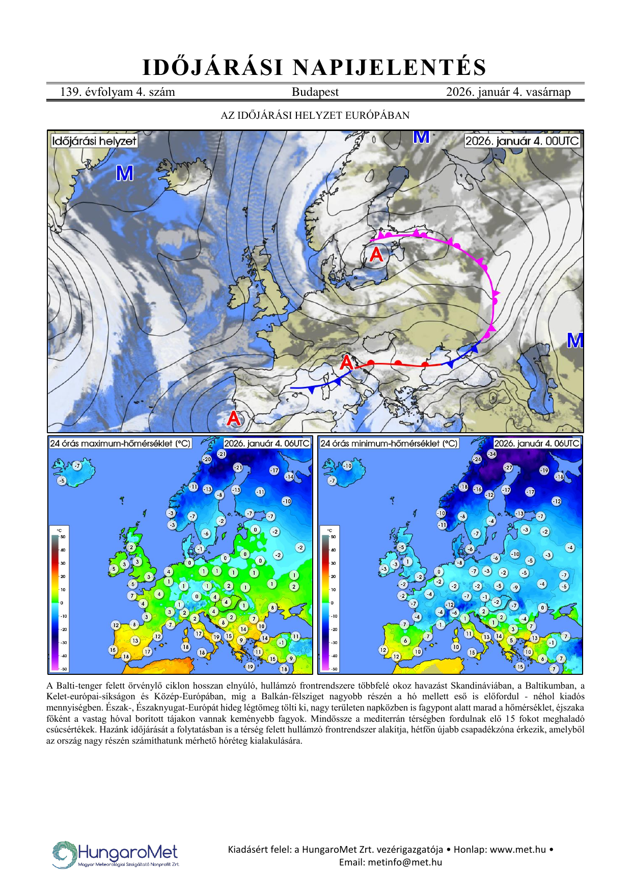 Az európai kitekintés a fronttérkép és a rövid szöveges elemzés mellett bővül a hőmérséklet napi minimum- és maximumértékeit ábrázoló térképekkel.