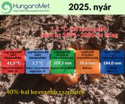 A HungaroMet Nonprofit Zrt. mérései alapján a 2025-ös nyár középhőmérséklete országos átlagban 1,2 fokkal meghaladta az 1991–2020-as éghajlati normált, amivel a hetedik legmelegebb 1901 óta. Több hőhullám is kialakult a nyáron, júliusban a mért legmagasabb hőmérséklet meghaladta a 40 fokot is. Csapadék tekintetében az évszak nagyon száraz volt, a legszárazabb júniust követően a júliusi és augusztusi csapadékmennyiség is elmaradt a szokásostól, ami összességében a tizedik legszárazabb nyarat eredményezte a XX. század kezdetétől.