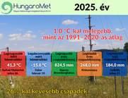 A 2025-ös év középhőmérséklete országos átlagban 1,0 fokkal meghaladta az 1991–2020-as éghajlati normált, amivel a hetedik legmelegebb a XX. század kezdetétől. Az év legnagyobb részében a szokásosnál sokkal magasabban alakult a hőmérséklet. A 2024-es aszályos évet követően 2025-ben még kevesebb csapadék hullott, és országos átlagban a 2025-ös év a negyedik legszárazabb volt 1901 óta.